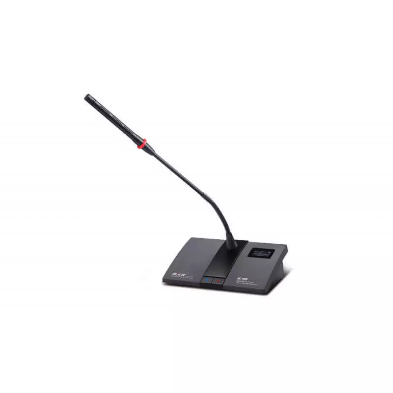 BKR DCS-E2403C (микрофон 140 мм ) - Микрофонный пульт с функцией видеослежения. Пластиковый корпус, стильный укороченный микрофон. Благодаря технологии флокирования, корпус устойчив к царапинам. Кнопка включения: продолжительное нажатие – вкл/выкл микрофон, кратковременное нажатие – активация микрофона. Кнопка управления микрофоном делегата. Дисплей размером 128×64 отображает рабочее состояние и информацию