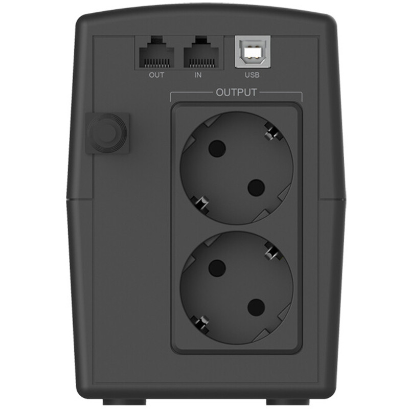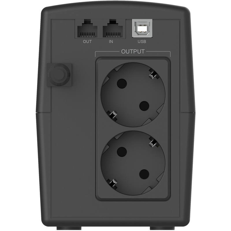 ИБП оснащен двумя розетками стандарта Schuko, а также интерфейсами HID-USB и RJ45/11, что позволяет подключать не только компьютеры и периферийные устройства, но и сетевое оборудование.