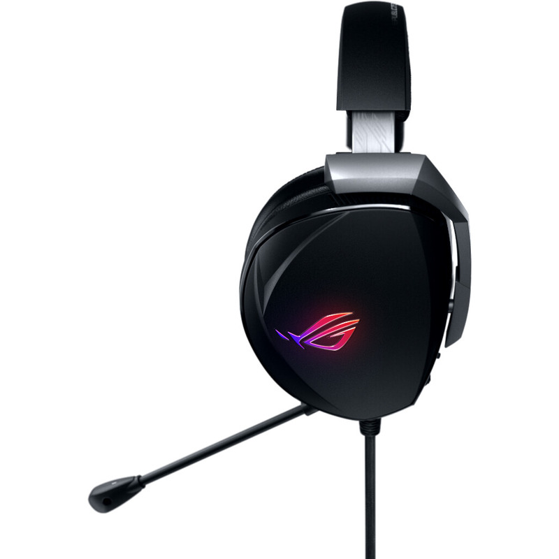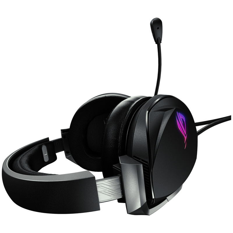 Оголовье и чашки наушников гарнитуры ROG Theta 7.1 изготовлены из алюминиевого сплава, который способствует рассеиванию тепла и наделяет устройство прочностью, необходимой для геймерского аксессуара. Для удобства пользователя на самой гарнитуре имеются элементы управления, с помощью которых можно моментально выбирать режим звука (пространственный или стерео), настраивать громкость, отключать микрофон и управлять подсветкой.