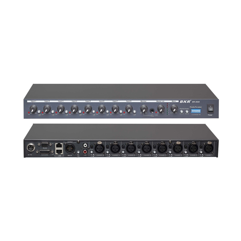 Аудиомикшер BKR BR-2820 автоматически преобразовывает любой входящий сигнал, регулировка уровня вручную или автоматически специальной функцией, которая при необходимости может понизить уровень автоматически. Работает с интерфейсом RS232, позволяющим подключить до 16 устройств вместе - это создает возможность подключения 128 микрофонов одновременно.