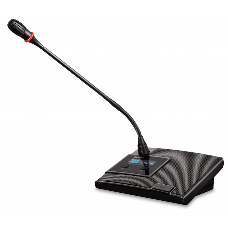 Проводной микрофонный пульт делегата Gestton EG-6620D на "гусиной шее" черного цвета. Длина микрофона «гусиная шея» 420 мм. Совместим с блоком управления EG-6620M. Получает питание от центрального блока. Микрофонный пульт оснащен OLED экраном и кнопками регулирования громкости встроенного динамика и наушников.